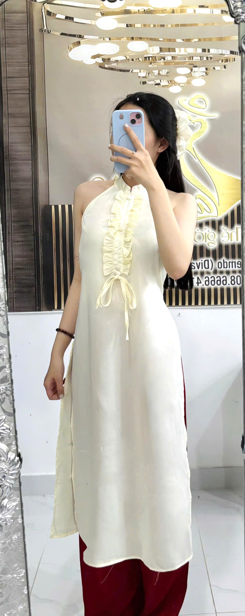 Kết hợp với quần lụa đỏ đô sang trọng, tạo nên tổng thể hài hòa, nổi bật, thích hợp mặc trong các dịp lễ hội, Tết, chụp ảnh kỷ niệm hoặc sự kiện truyền thống.