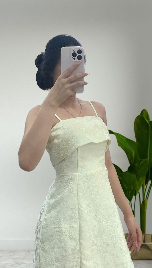 Chất liệu gấm hoa cao cấp với hoa văn chìm sang trọng, giữ dáng váy ổn định nhưng vẫn thoải mái khi mặc. Gam màu trắng kem dễ phối phụ kiện, phù hợp cho nhiều dịp từ tiệc nhẹ đến sự kiện sang trọng.
