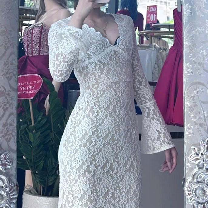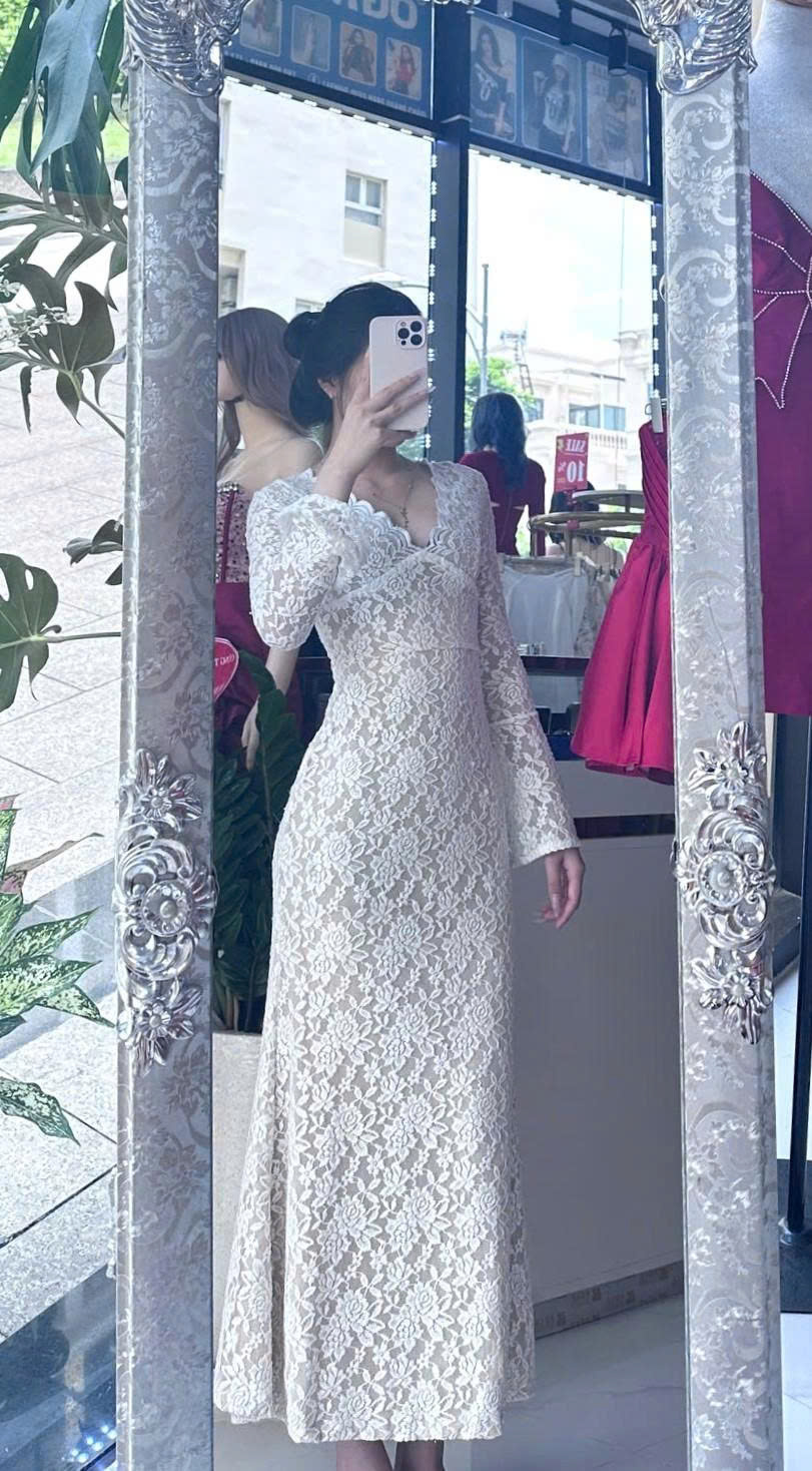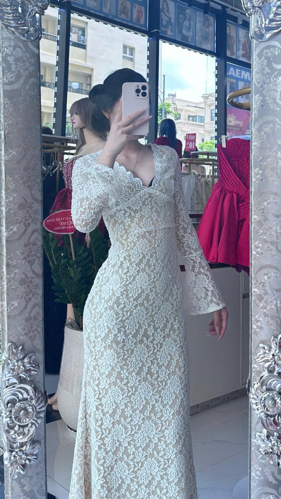 Chiếc váy ren trắng dài mang phong cách thanh lịch và đầy tinh tế. Thiết kế cổ chữ V sâu vừa phải, tôn vòng một gợi cảm mà vẫn giữ sự duyên dáng, nữ tính. Tay dài loe nhẹ giúp che khuyết điểm cánh tay và tạo sự mềm mại khi cử động.