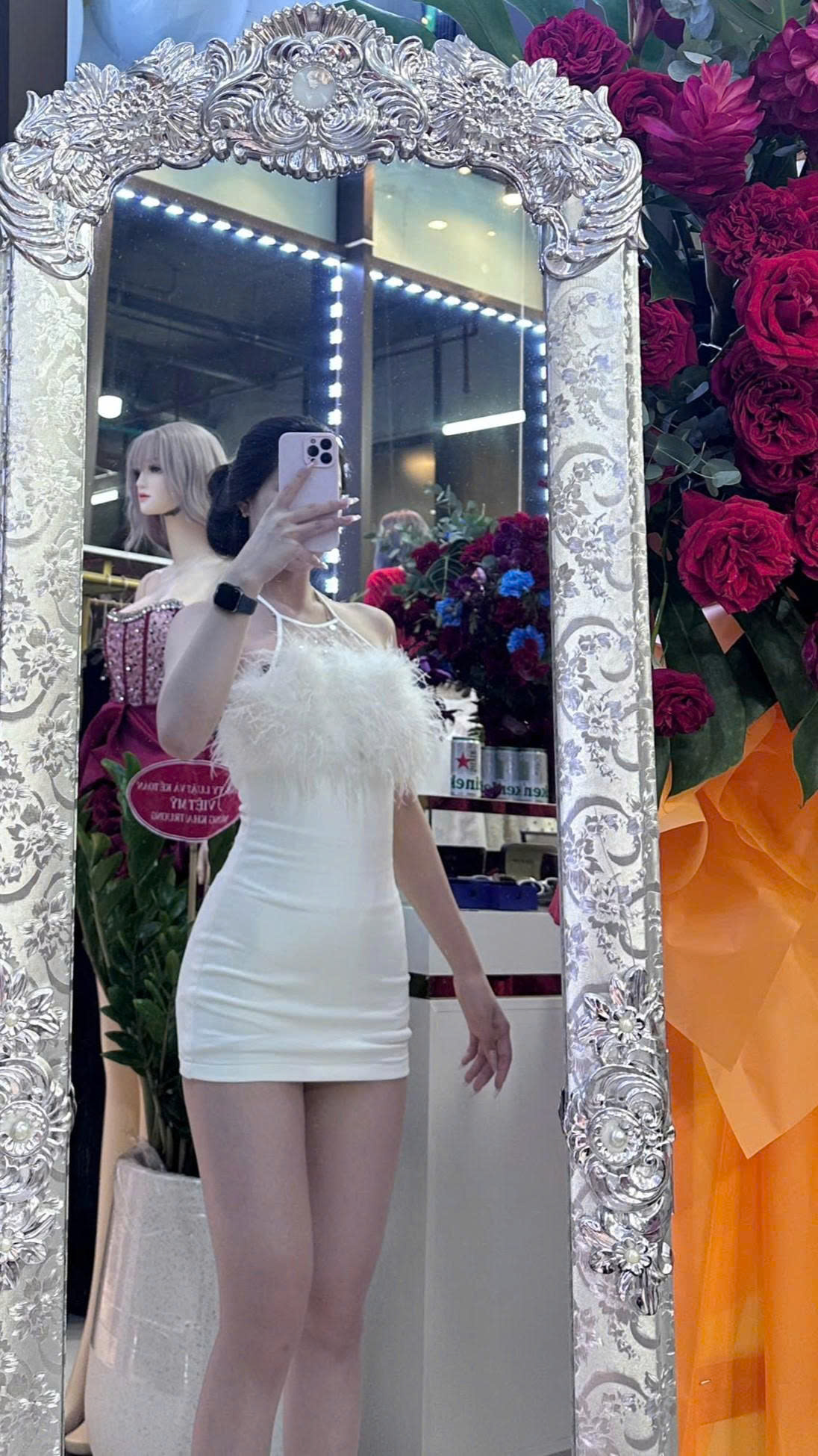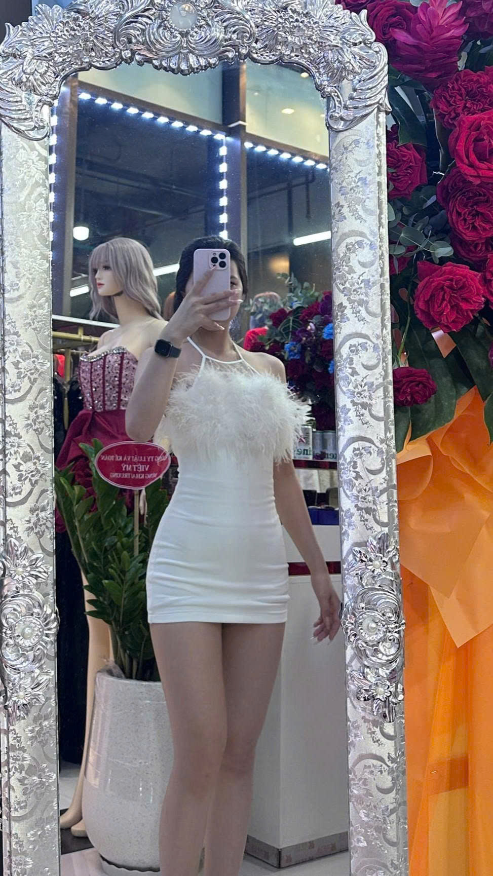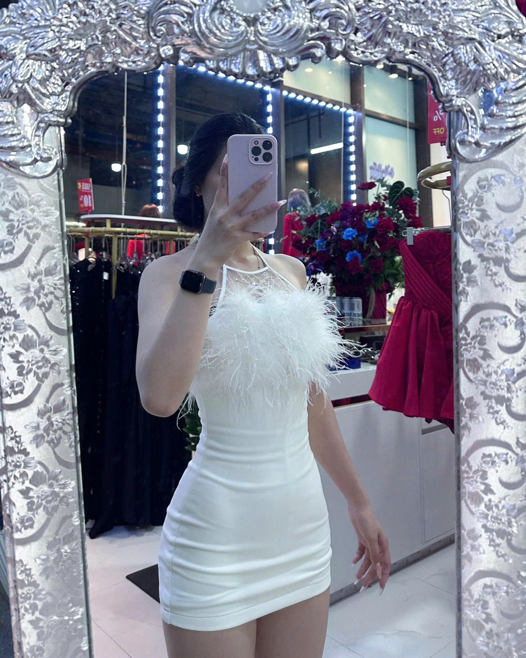 Điểm nhấn độc đáo nằm ở chi tiết lông vũ mềm mại ở phần ngực, không chỉ làm nổi bật vòng một mà còn tăng thêm sự sang trọng, giúp bạn nổi bật trong mọi sự kiện. Cổ yếm khoe bờ vai và xương quai xanh tinh tế, mang lại vẻ cuốn hút khó rời mắt.